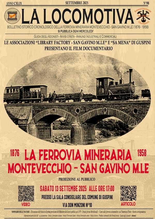Sabato 13 settembre a Guspini sarà invece il momento della proiezione del documentario “La ferrovia mineraria Montevecchio – San Gavino Monreale 1876-1958”, curato dalle associazioni Library Factory di San Gavino e Sa Mena di Guspini. L’opera ripercorre la storia della linea ferroviaria che per oltre ottant’anni ha collegato le aree minerarie a San Gavino, costituendo un’infrastruttura vitale per l’economia mineraria dell’isola.