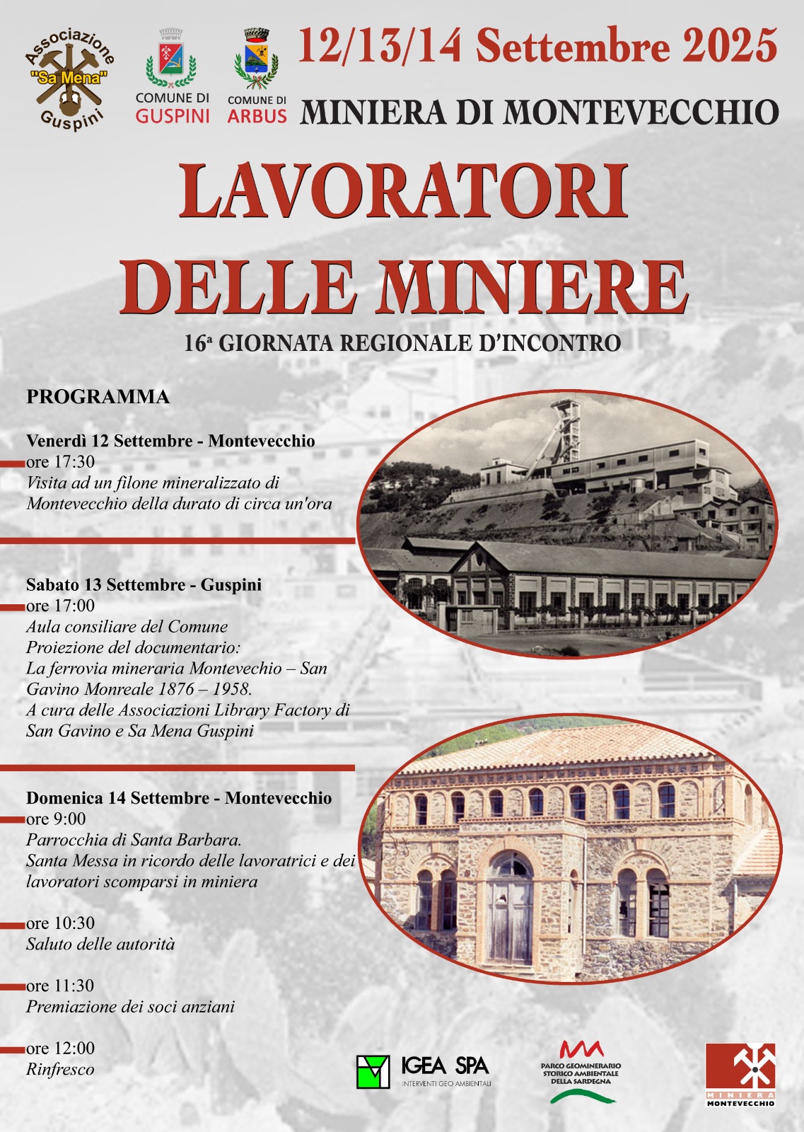 La giornata conclusiva, domenica 14 settembre a Montevecchio, sarà dedicata alla memoria e alla comunità. Alle 9:00, presso la parrocchia di Santa Barbara, si terrà la Santa Messa in ricordo delle lavoratrici e dei lavoratori scomparsi in miniera. A seguire, alle 10:30, ci sarà il saluto delle autorità, quindi la premiazione dei soci anziani e, infine, un rinfresco conclusivo.