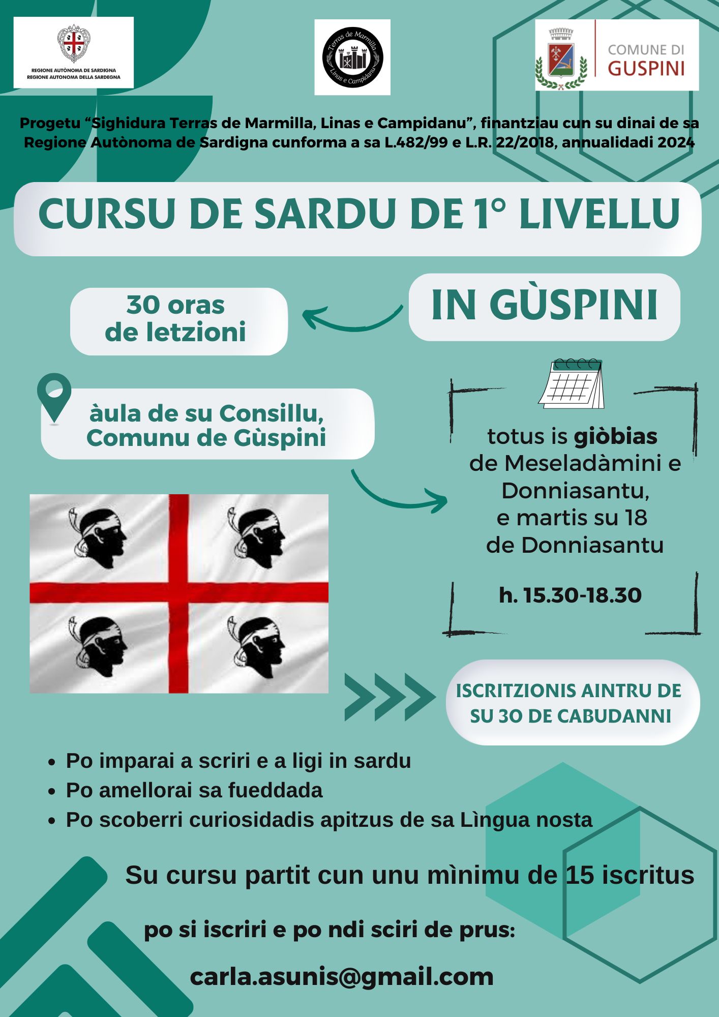 Il Comune di Guspini, partner del Comune di Sanluri nel progetto "Prosecuzione Terras de Marmilla, Linas e Campidanu”, informa i cittadini che sono aperte le iscrizioni al Corso di Lingua Sarda di 1° livello che inizia giovedì 2 Ottobre 2025, che si svolge in Comune presso l’Aula Consiliare. Possono partecipare anche coloro che non sono residenti nel Comune di Guspini ma il corso non avrà inizio se non si raggiunge il numero minimo di 15 iscritti. Per iscriversi c’è tempo fino al 30 di Settembre 2025.