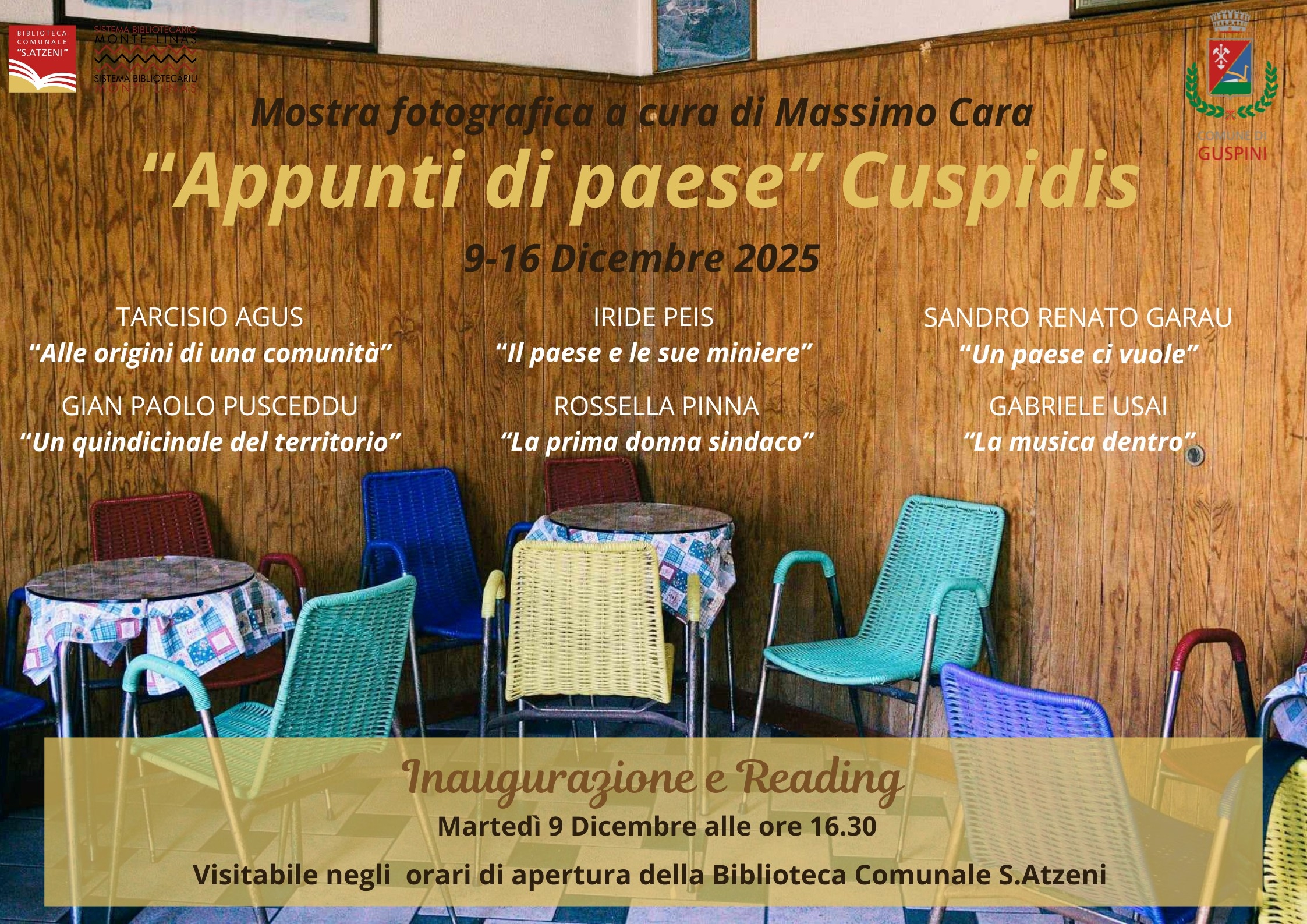 Dal 9 al 16 dicembre sarà visitabile negli spazi della Biblioteca la mostra “Appunti di paese – Cuspidis”, una raccolta di immagini realizzate da Massimo Cara che raccontano, attraverso scatti d’epoca e di documentazione, alcune storiche attività commerciali di Guspini.
