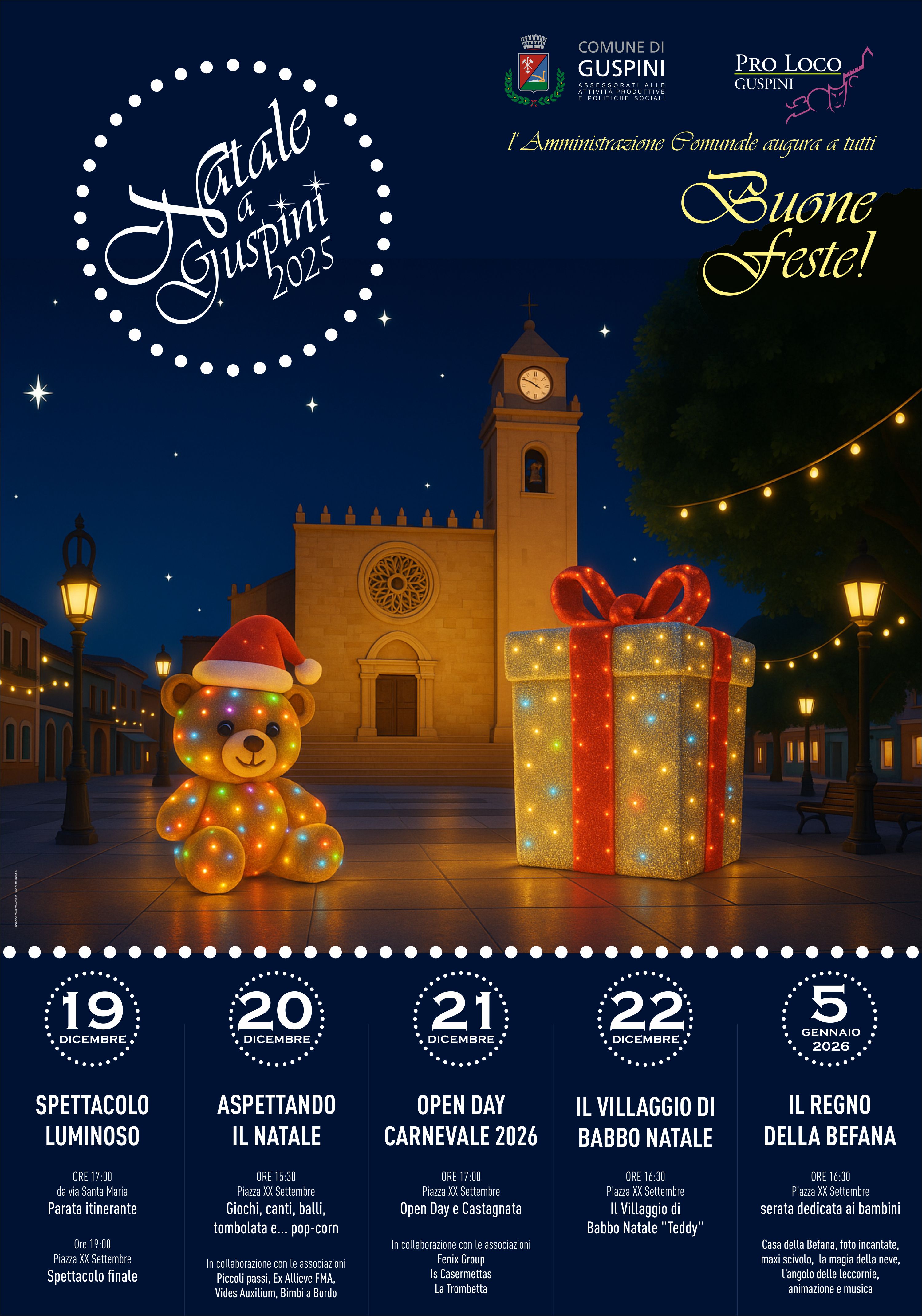 Con il programma ora definito, Natale a Guspini 2025 si conferma come un percorso diffuso di iniziative che unisce cultura, partecipazione e comunità, accompagnando cittadini e visitatori per tutto il periodo delle festività.