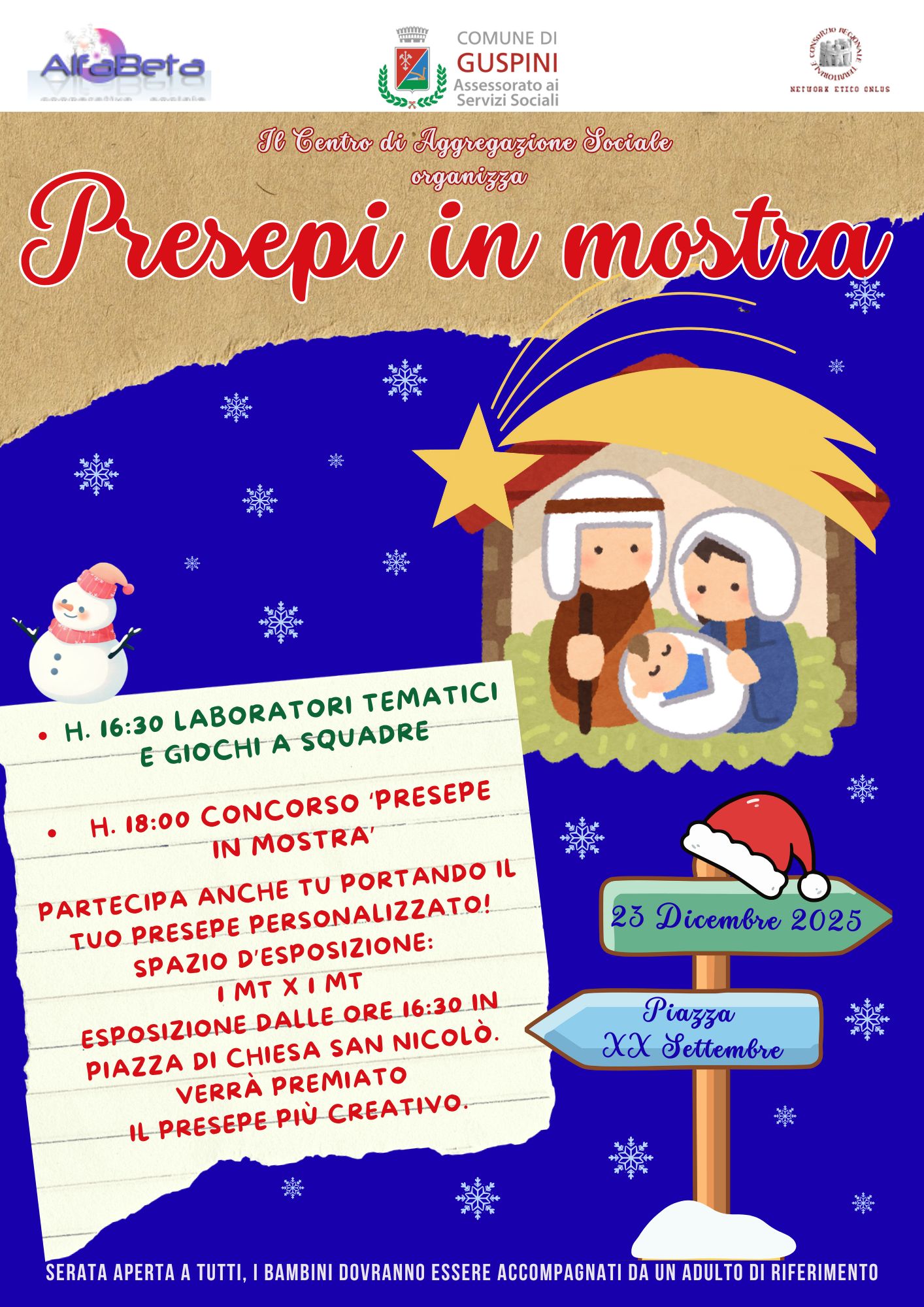 Il Centro di Aggregazione Sociale, in collaborazione con il Comune di Guspini – Assessorato ai Servizi Sociali e la rete associativa del territorio, organizza l’iniziativa “Presepi in mostra”, in programma lunedì 23 dicembre 2025 presso Piazza XX Settembre, nell’area antistante la Chiesa di San Nicolò.